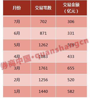 wind数据显示,5月大宗交易数量为1262笔,6月和7月降至871笔、702笔。5月的成交金额为519亿,6月和7月降至331亿和306亿。