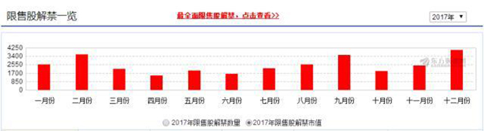 今年9月份,将有3524亿市值的限售股解禁,这是今年限售股解禁市值的第三高。2018年将迎来巨量的限售股解禁。数据显示,2018年将有2899亿股、3.48万亿市值的限售股解禁。