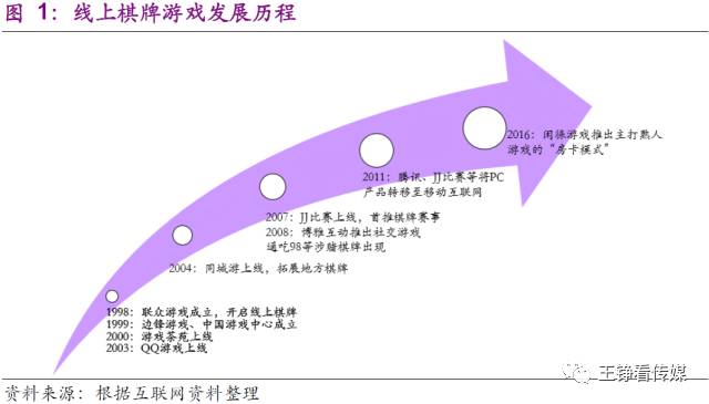 线上棋牌游戏至今共经历了五次比较大的里程碑:1998年联众游戏首推线上棋牌;2004年,同城游开启了地方棋牌的方向;2007年,线上棋牌开启多元化发展模式,如竞技化、社交化等等;2011年,腾讯、JJ比赛等移动化;2016年,闲徕游戏开创主打熟人的房卡模式。