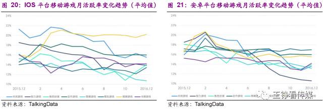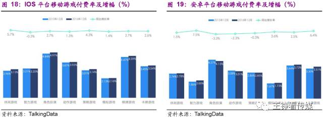2016年末和2015年末,棋牌游戏的付费率表现优秀,仅次于角色扮演类游戏,且IOS平台略高于安卓平台。