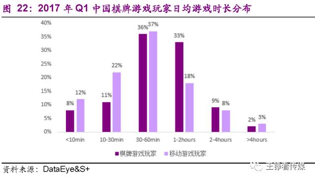 另外,棋牌游戏相比其他手游更为耗时,超过80%的棋牌游戏用户的日均游戏在30分钟以上。与移动游戏的平均水平相比,棋牌游戏玩家中重度玩家偏多。