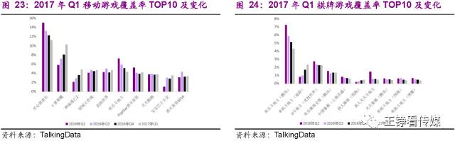 2017年Q1,移动游戏覆盖率的TOP10基本保持稳定,其中《王者荣耀》的覆盖率提升迅速,与第一名《开心消消乐》只差1%左右。棋牌类游戏第一季度覆盖率TOP10以全国棋牌为主,覆盖率整体有下降趋势;但途游的《单机斗地主》与四海的《四人麻将》覆盖率提升显著。