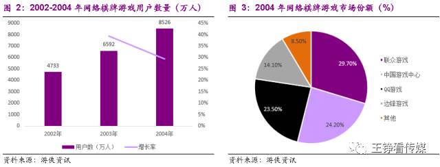 2004年,QQ游戏、联众、边锋、中游、茶苑等已经占据了较高的市场份额,其中联众游戏、中国游戏中心和QQ游戏合计占据约80%的市场份额。