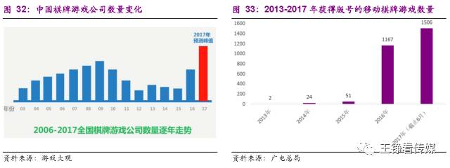 随着2016年“房卡”模式的流行,大批厂商深探地方棋牌;自去年7月1日总局版号规定正式实施以来,棋牌手游每月过审数量都遥遥领先其他游戏。截止2017年6月,约2750款移动棋牌游戏获得了版号。公司和游戏产品数量激增竞争激烈化。