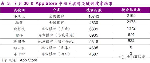 全国性的棋牌游戏,规则全国通用,游戏品类和玩法有限且用户量大,经过十几年的发展目前已进入饱和状态,因此竞争十分激烈。以全国性棋牌游戏的代表作——斗地主为例,其在App Store中的搜索指数超过一万(搜索指数表示该关键词的搜索热度,指数越高,则该词每天被搜索越多),搜索结果数(搜索关键词后,列出的所有结果产品个数)也高达2165,而一些地方棋牌关键词比如“砸六家”、“斗十四”等搜索热度约为斗地主的一半,但是app的搜索结果数却远远小于斗地主。App Store关键词搜索结果可以从侧面反映出全国性棋牌的竞争压力远远高于地方性棋牌。