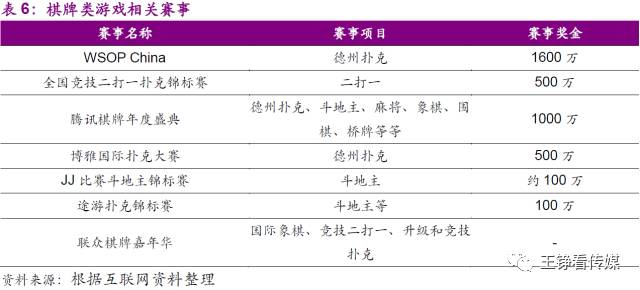 国内的棋牌赛事大多为第一方赛事,平均金额低于电竞总体的赛事奖金。不过随着近年国家体育总局启动的竞技二打一官方赛事、腾讯引入的WSOP China赛事等高奖金赛事的开展,棋牌竞技将迎来进一步的发展。