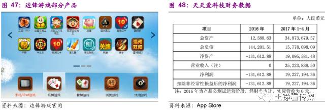 (b)天天爱科技成立于2016年05月18日,模式分为房卡和金币卡两种,游戏玩家以购买钻石的模式在游戏平台中进行消费。天天爱2017年1-4月营业收入3522.38万元,净利润1922.72万元,毛利率91.98%,处于业内较高水平。深圳天天爱与杭州边锋主业相近,在渠道推广方面具有丰富经验,在江苏、广西、河南、安徽、甘肃等多省份已形成较为领先的市场份额。