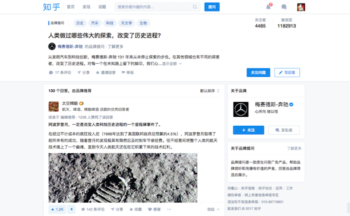 7 月 20 日,在人类登月纪念日之际,奔驰在知乎发问:「人类做过哪些伟大的探索,改变了历史进程?」据了解,半天内该问题得到了近 120 万次的浏览,和 171 个回答。自发在这个问题下参与回答的,也包括「太空精酿」等知乎高关注用户。