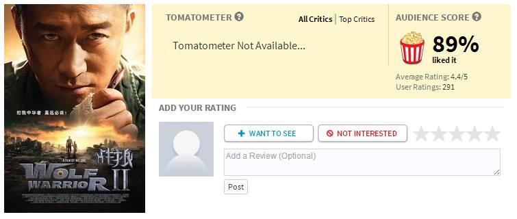 无论在国内还是海外,《战狼2》都斩获了不错的口碑。在豆瓣上,这部电影的评分高达7.6分,好于79%的动作片。在国外权威影评网站上,《战狼2》同样收获了好评。在烂番茄网站上,89%的观众给出了好评,IMBd综合评分也高达7.4。