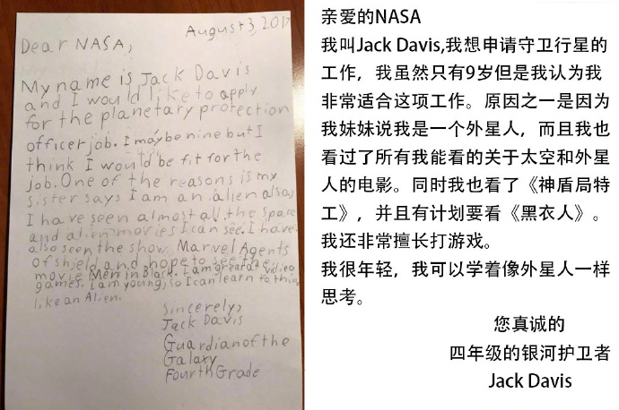 9岁男孩向NASA申请任“行星保卫官” 求职信高萌预警