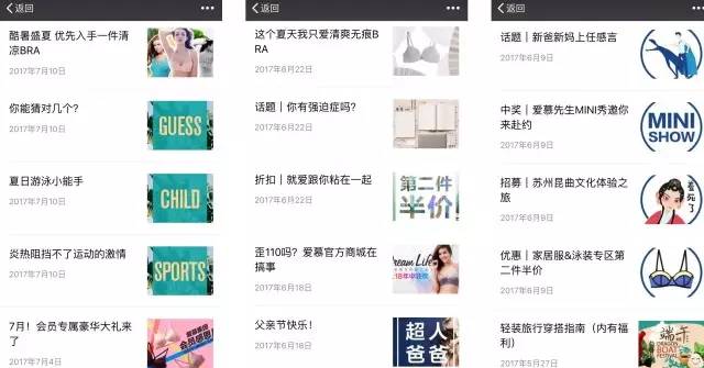 爱慕主账号最初是以品牌产品发布为基础的订阅号,两年前开始转为服务号,因为品牌多、产品广、信息量大,导致内容量繁冗,最多时一期推送了8条内容。当然,这种情况很快就得到了改善,本着从用户角度出发的原则,主账号开始控制内容的数量和质量,将每次发送的内容控制在3-4条,注重协调内容和消费者心理,并且对整体功能加大开发力度。毕竟一味的追逐曝光量对于实际的阅读率并没有什么帮助,甚至有可能起到的是反作用。