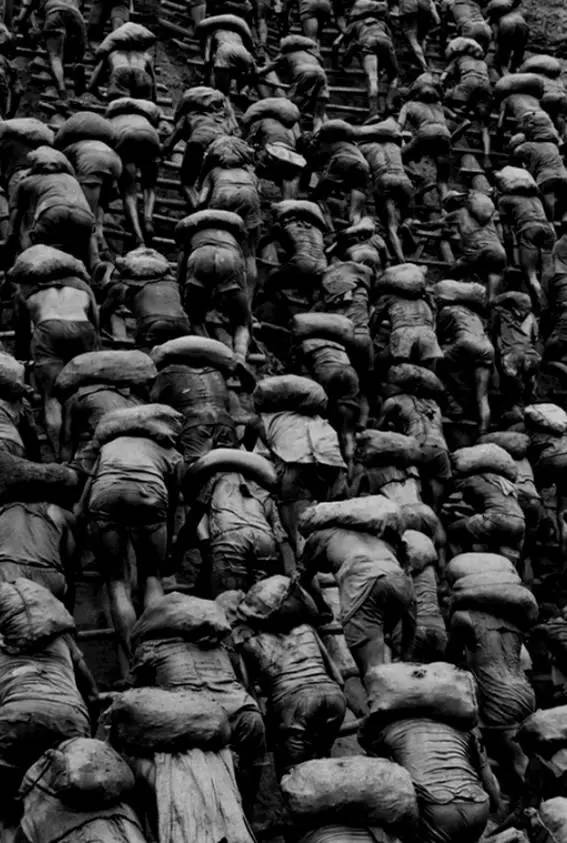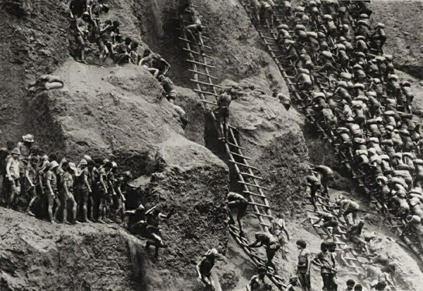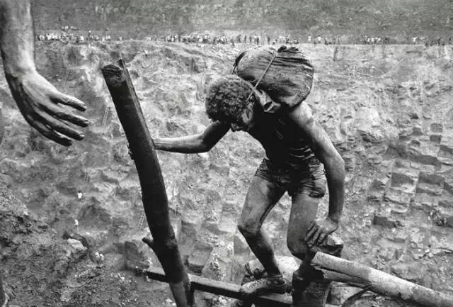 奴隶式的劳作,蝼蚁式的拥挤,恢宏的、地狱般的场面,整个画面令人震撼,古代建造长城或金字塔的场景大概就是这样吧。不过这是1986年巴西帕拉达高原的露天金矿,与过去奴工不一样的是,这些矿工都是来淘金的自愿者。他们不仅有工资,而且在发现有金矿矿层时,矿工还能自己挑选一袋矿土,运气好的话便可得到黄金。这种如博彩般的方式,引诱了无数淘金者前来冒险。人们在这里淘金,全凭人力进行运输,这一系列作品成为了萨尔加多最著名的作品,也是劳动者最好的写照。