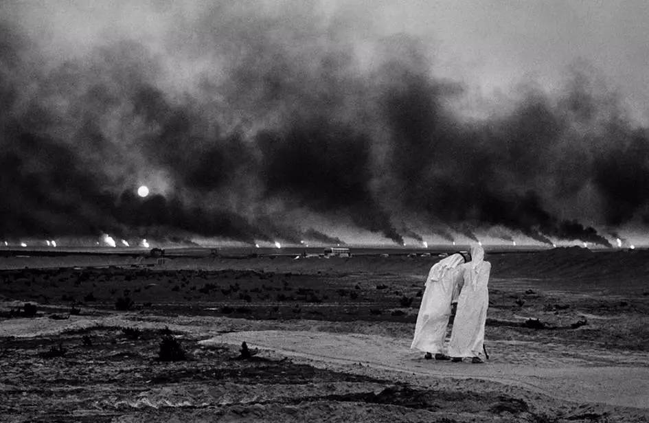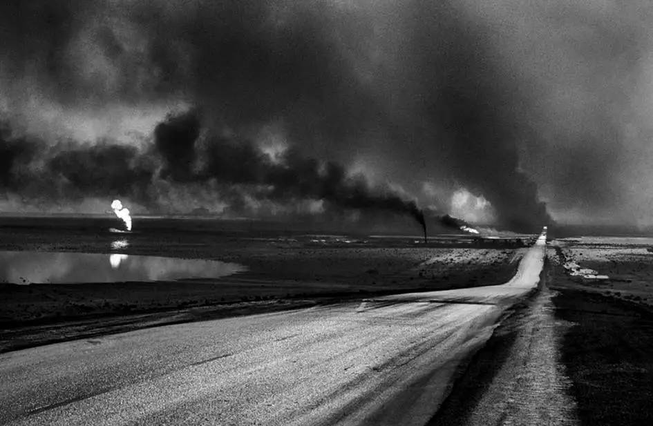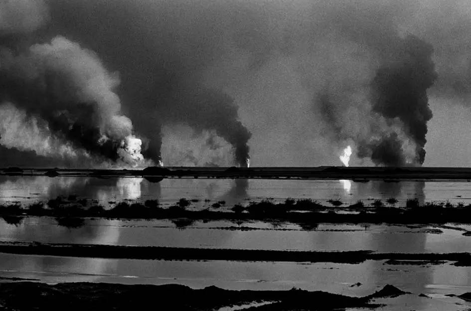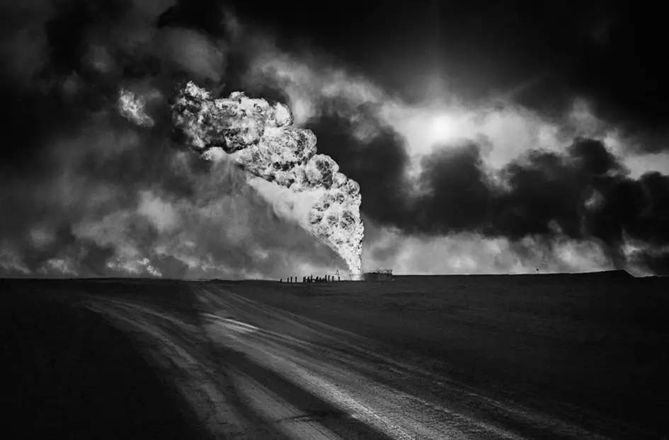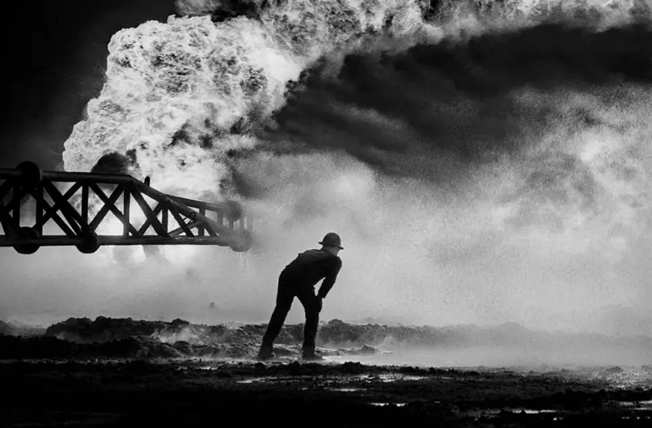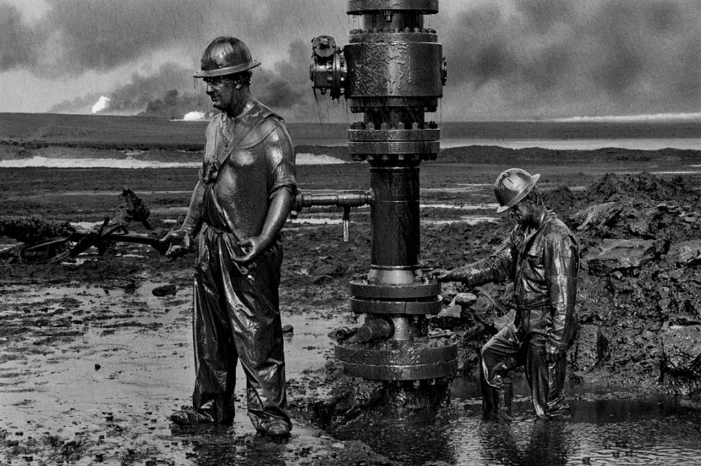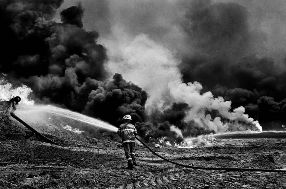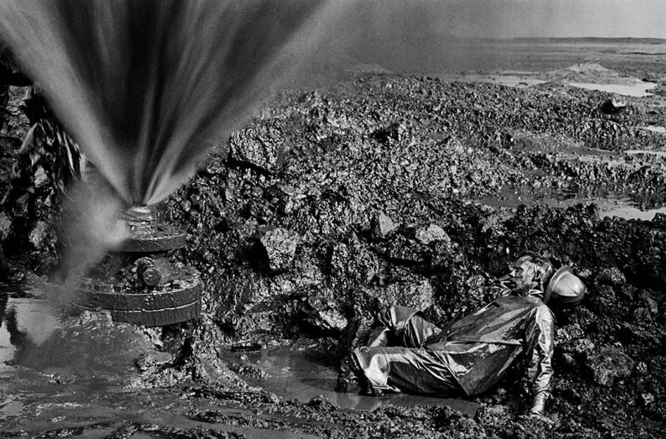 照片里这些满身石油的人,是来自加拿大卡尔加里的消防员。他们有一辆漂亮的红色消防车,每天晚上回到驻地,他们都会把车刷洗得干干净净,但第二天一大早,他们又开着漂亮的消防车重返油田…
