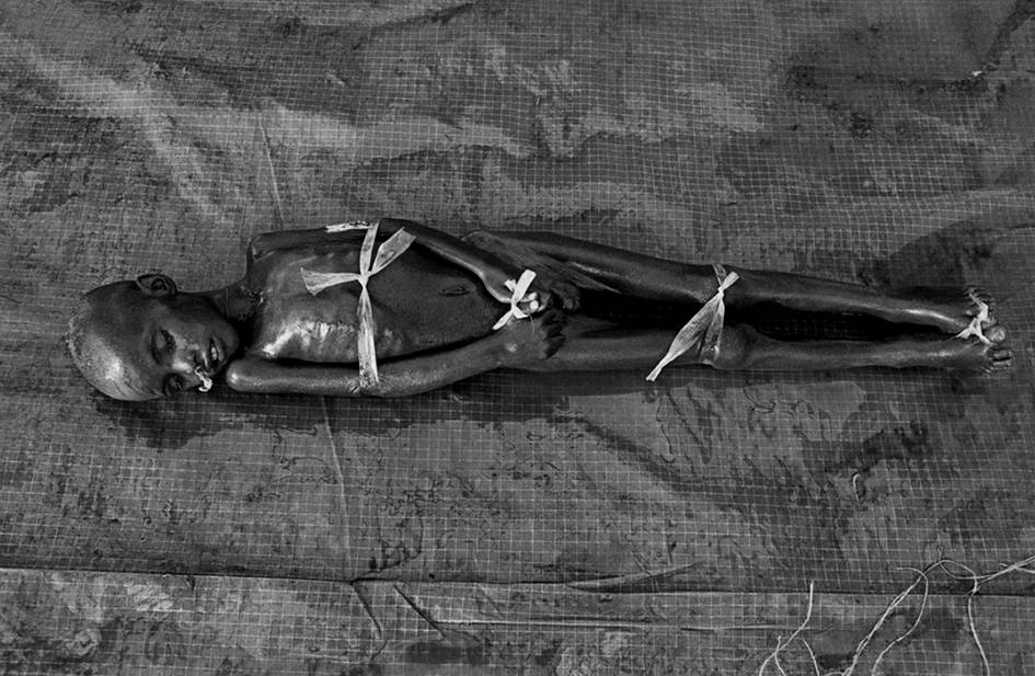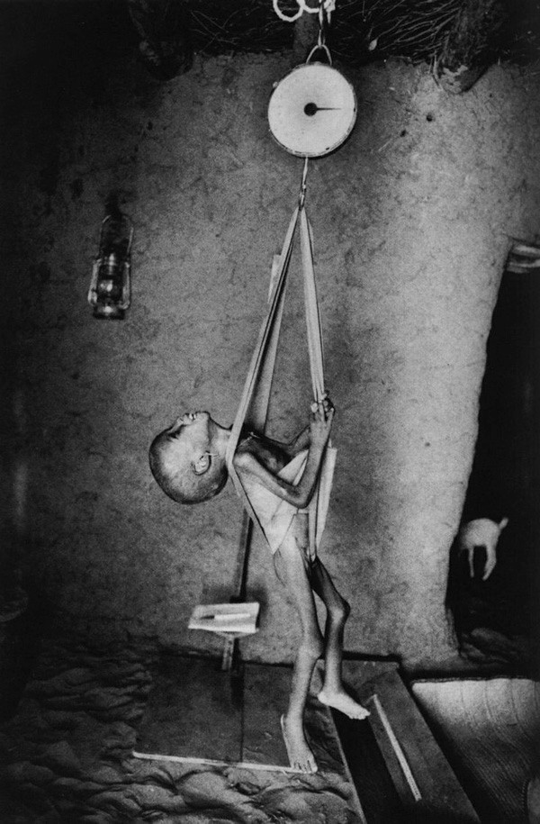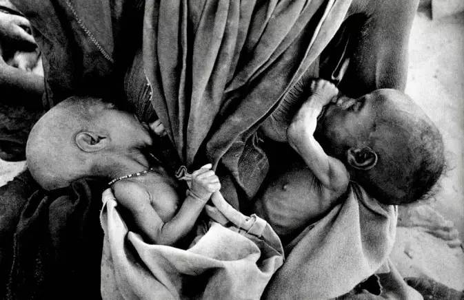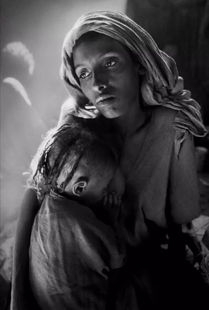干瘪的乳房和营养极端不良而瘦得皮包骨头的婴孩,让人不禁产生揪心之痛,很难 想象婴孩努力吸出来的究竟是乳汁还是脓血,照片煽情的力量在这里达到了极致, 哪怕一个描述的字也显得多余。
