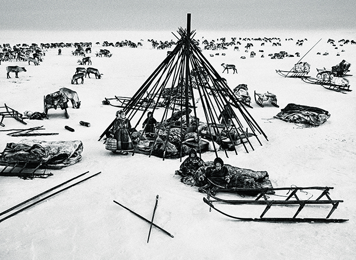 当气候急剧恶化,涅涅茨人和他们的驯鹿便会在一个安全地段停留数日。摄于俄罗斯西伯利亚的亚马尔半岛, 鄂毕河以北的北极圈。