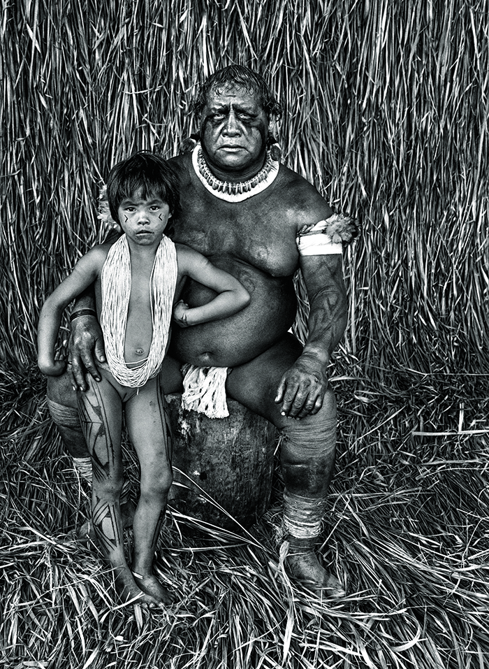 Kuikuro族人首领与他的小女儿,他们面对镜头时十分具有仪式感。上鑫谷,马托格罗索州,巴西。2005年