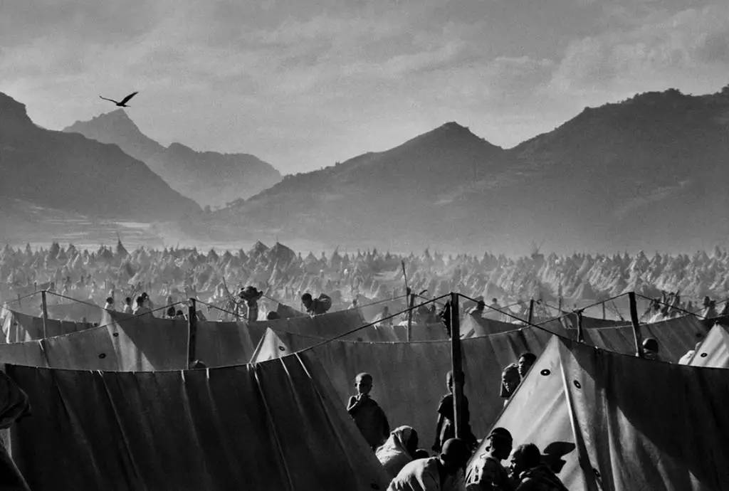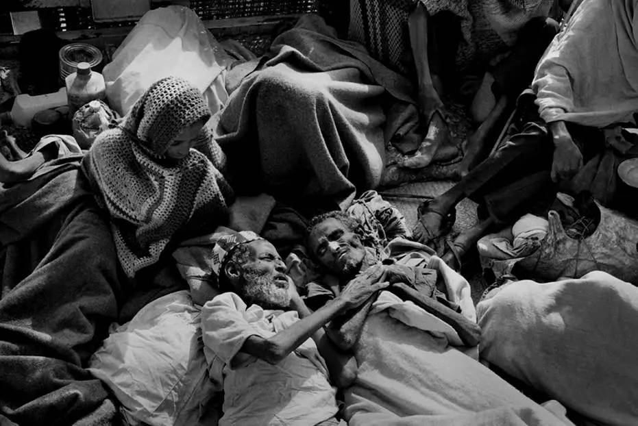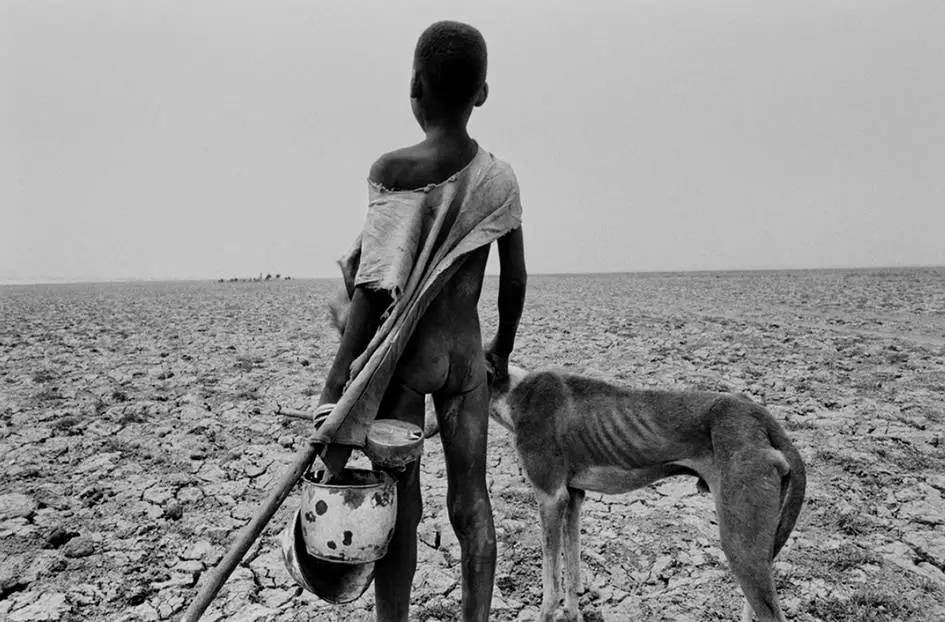 这张照片里的是科普特人,他们来自埃塞俄比亚的北部地区。他们信奉科普特教,一年中必须禁食200多天,即使孩子快饿死了,也绝不违反教规,他们只等待死亡的降临。在这里,死亡是日常生活的一部分。由于见过太多的死亡,他们的心理有很强的免疫能力,已经能随时接受亲友的离去。他们年轻的脸庞上,有一双行将就木的眼睛,空洞而无神。