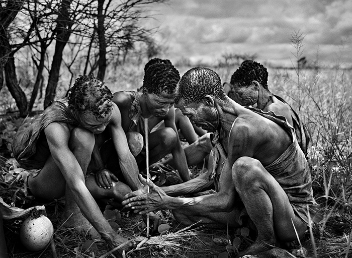卡拉哈里荒漠地区的布须曼人,这里的土著人扔在使用远古的钻木取火的方式而生活