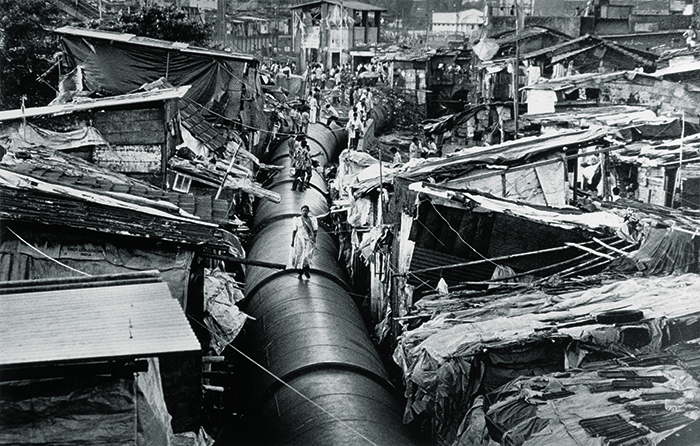 巨大的供水管穿越了孟买的贫民窟,这里离机场不远,并开始嵌入了中产阶级居住区。印度,1995年