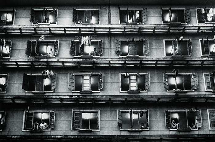 胡志明市的贫民习惯于这样坐在窗口,他们对于离地面的距离毫不在意。越南,1995年