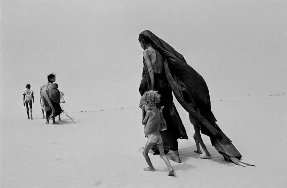 1993年至1999年,萨尔加多在40多个国家拍摄的作品,汇集成了史诗般的《迁徙》,包含了国际迁徙、难民、非洲悲剧、离乡背井的人口城市化、当今世界的儿童5个部分,他由此体验到人的迁徙成为这个世界日益增强的移动性的直接表现。其实,人类的生活史就是迁徙史,从《圣经》中记载的“出埃及记”,到现代经济增长中的农村人口流动性,无一例外地显示了人们追求更安全、更美好生活的强烈愿望。良好的经济学素养,丰富的经历,使得萨尔加多能够挖掘影像背后的一些内容,诸如资源和战乱、环境退化和人口压力、地缘政治和经济利益的关系等等,考察这些内容有助于解释“全球化”的面目。作为一个长期远离家乡生活的摄影师,萨尔加多有着深刻的感同身受:“我希望人们看过这些照片以后,能够用一种带有尊重的、全新的眼光看待身边的移民。希望坐在美国某个餐厅里的年轻人看到墨西哥裔侍者时,能够想到他或他的祖先长途跋涉来到这里,他们在这里充满勇气,推进着生活,为了工作和尊严打拼。这样的精神,存在于我的每张照片之中。”