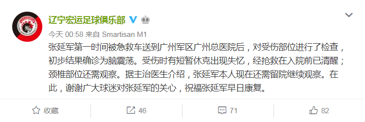 8月7日凌晨,辽宁宏运足球俱乐部官微通报张延军病情,初步诊断结果为脑震荡,目前已清醒,但仍需留院观察。比赛结束后,撞伤张延军的富力球员叶楚贵也前往医院探望张延军。