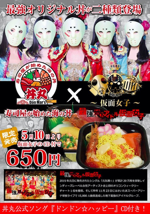 在地下偶像中已经颇具知名度、号称“最强地下偶像”的假面女子就推出过不少合作。一个日常表演中全是面具的女团已经足够有噱头(当然成员颜值都在线),她们的联名合作也横跨各个领域。比如在女子汗味炸鸡之前,她们推出过一款口味更正常的假面女子海鲜饭——而且是和CD打包卖,海鲜饭加附录的CD售价650日元;还与位于二次元圣地秋叶原的神社合作,推出了假面女子主题的护身符和许愿绘马。