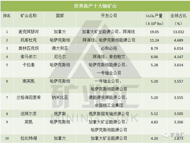麦克阿瑟河是目前世界上产量最大、品位最高的铀矿山,储量为1. 40百万t,资源量41. 1万t,平均品位达10. 06%。