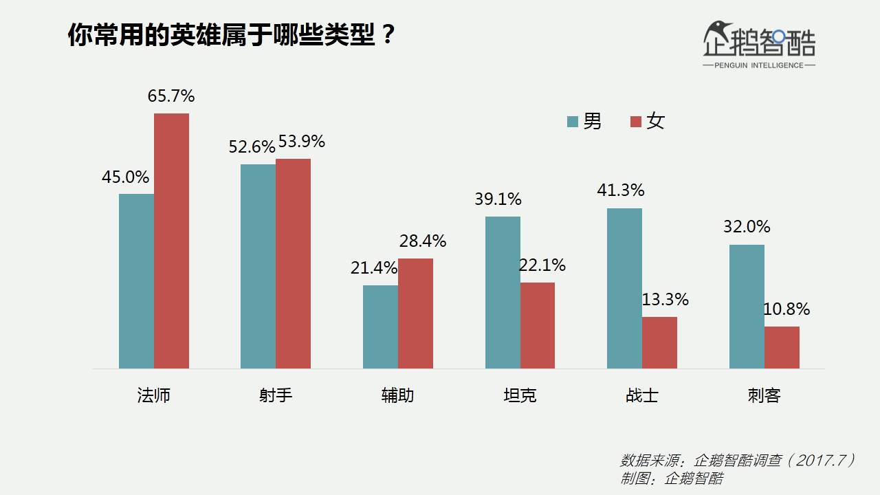 但从团队组合的需要方面来考虑选英雄方面,女性玩家里的占比则低于男性玩家,前者的占比为27.1%,后者则达到了42.8%。