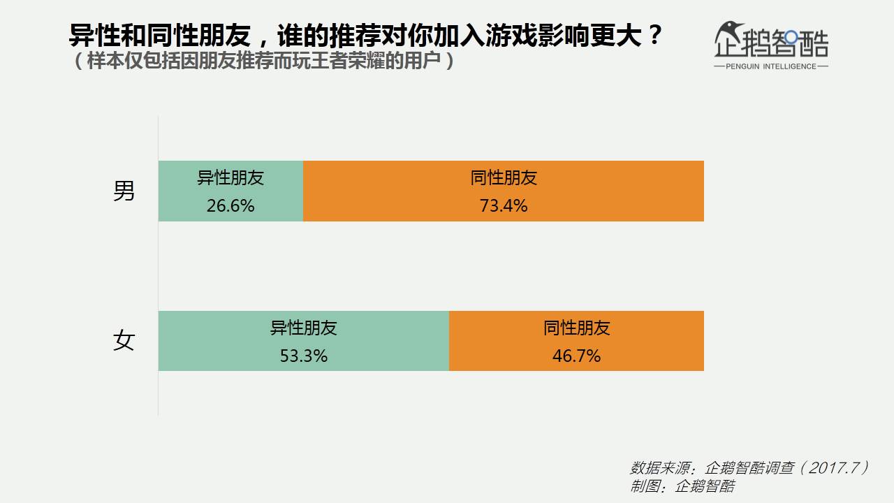 最终因朋友推荐进入游戏的玩家中,男性里有接近四分之三是受男性朋友的推荐影响更大。而女性玩家里,并不仅仅是受男性朋友的影响,也有46.7%的女玩家是因为女性朋友推荐而加入游戏。
