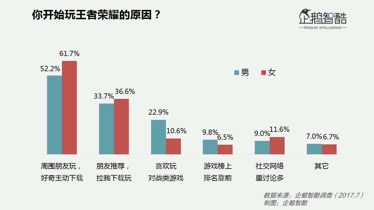 因周围朋友玩而引发了自己的好奇,这是大多数玩家开始玩王者荣耀的原因。这一点女性玩家比男性表现得更为明显,前者的占比为61.7%,后者为52.2%。朋友推荐拉我玩和社交网络里讨论多的比率里,女性表现也略高于男性。