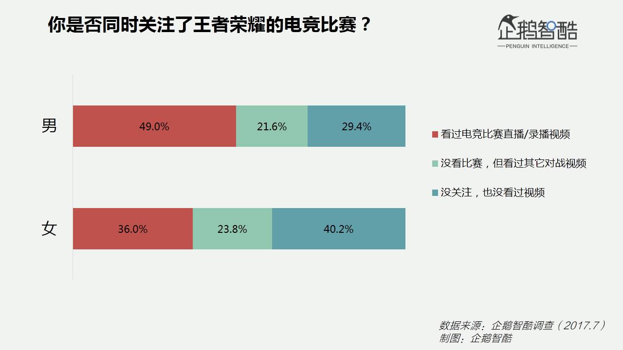 9.王者荣耀带动电竞比赛观看,有36%的女性玩家也加入了观看队伍,男性玩家里的观看占比约一半。
