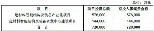 所募资金在扣除发行费用后将全部用于投资超材料智能结构及装备产业化项目、超材料智能结构及装备研发中心建设项目。