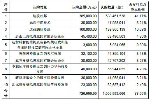 而在本次发行完成后,达孜映邦将持有本公司 41.17%的股权,成为公司的控股股东。同时,与达孜映邦同为刘若鹏博士控制的光启空间技术将以30,000万元参与本次非公开发行,本次发行完成后,光启空间技术将持有本公司 3.21%的股权。本次发行完成后,刘若鹏博士控制的达孜映邦和光启空间技术将合计持有本公司 44.38%的股权,刘若鹏成为公司新的实际控制人。