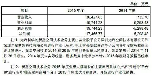 光启集团在尖端装备、新型空间、智慧园区三大领域均取得了业绩的高速增长:负责尖端装备业务的“光启尖端”,从2013年的682万元营收、130万元净利润,增长到2015年的8485万元营收、5237万元净利润;负责新型空间技术业务的“光启科学”,从2014年的736万元营收、-5298万元净利润,增长到2015年的36427万元营收、17466万元净利润;负责智慧园区解决方案业务的“光启创新”+“光启智慧”+“光启智能光子”,从2013年的1884万元营收、325万元净利润,增长到2015年的5913万元营收、980万元净利润。