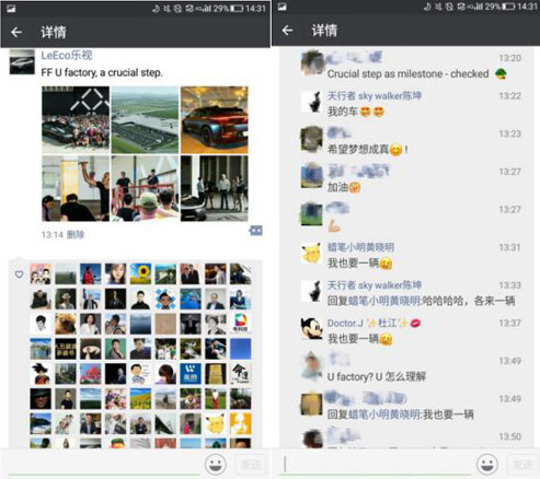 证券日报记者注意到,乐视汽车生态董事长贾跃亭于8月7日在朋友圈发布了新工厂揭幕的多张照片,并写下“FF U factory,a crucial step。”该条朋友圈随即获得了大量点赞和评论,其中不乏一些明星大咖,比如陈坤就评论说“我的车!”,黄晓明和杜江等也纷纷回复:“我也要一辆”,还有众多人为贾跃亭造车的这一重要进展表示了支持和鼓励。