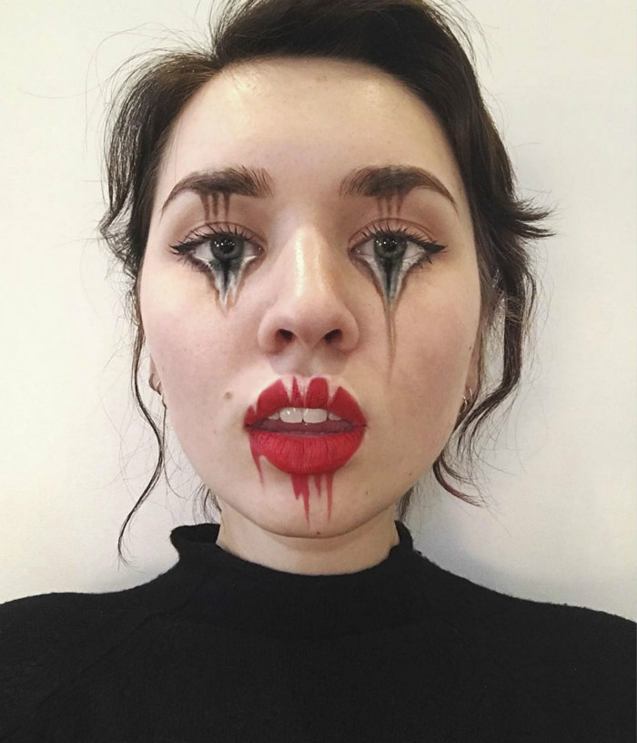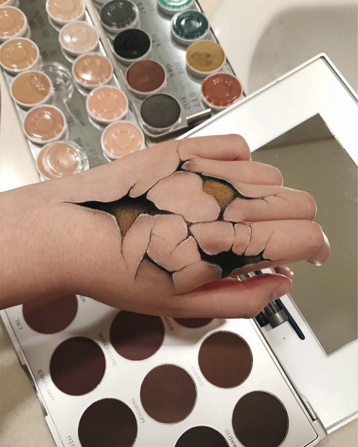 “我想要做一些不一样的事情,所以我在Instagram上找到了一张女人的照片。照片里,那个女人的脸就像是裂开了一样。我之前从来没有化过这样疯狂的妆容,但是还是拿出了自己的黑色和白色眼线笔,开始了尝试。”Mimi脑洞大开的化妆作品通过精巧的设计,在平面上创作出了3D图画。她的很多化妆作品就像是艺术家利用颜料和阴影,在她的身体上创造出了皮肤凸起或是凹陷的效果。