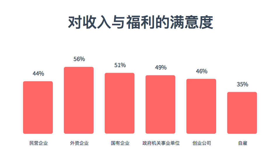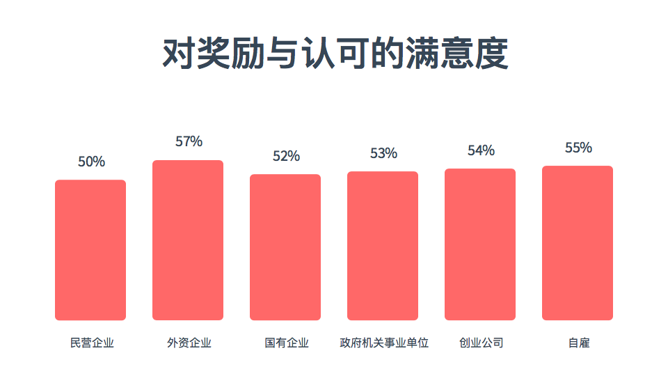 我们的调研结果显示,外企员工和其他类型的企业员工相比对雇主的满意度处于上游水平。在收入与福利、奖励与认可、雇主声誉、工作内容与自主权、沟通合作、管理人员这6个方面,外企员工对雇主的认可度是最高的。