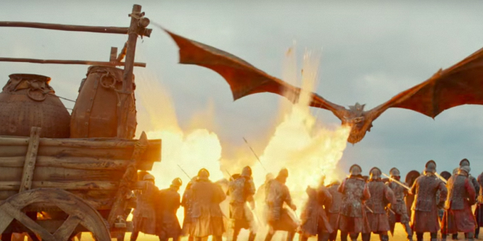 周日播出的《权力的游戏》的“火烧战利品之战”中,多斯拉克人在丹妮莉丝与她的龙“卓耿”的帮助下,将兰尼斯特军队打得一败涂地。这是该剧迄今为止最为宏大的战争场面——甚至超越了去年的“私生子之战”。“火烧战利品之战”将视觉特效与实际画面相结合,创造出了复杂而壮观的战争场面。