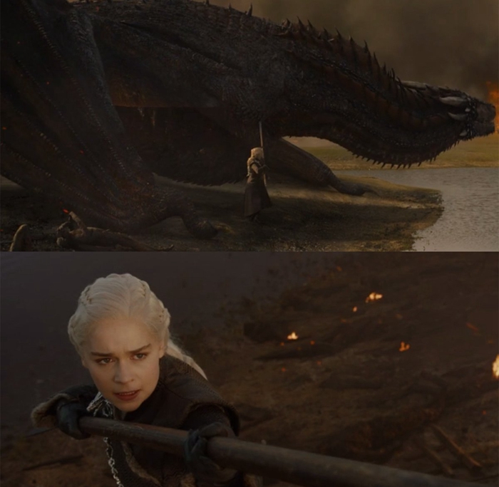 4. 当丹妮莉丝从她受伤的龙身上努力拔出长矛时,她确实是在拔一支矛。