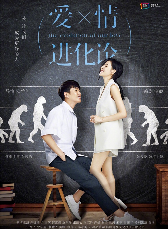 海报背景还原了达尔文进化理论,应该是暗示男女主角之间情感从无到有的变化路径。服装造型来看,张若昀身着白衬衫白球鞋,张天爱搭配白色衬衫裙,画风简单自然。