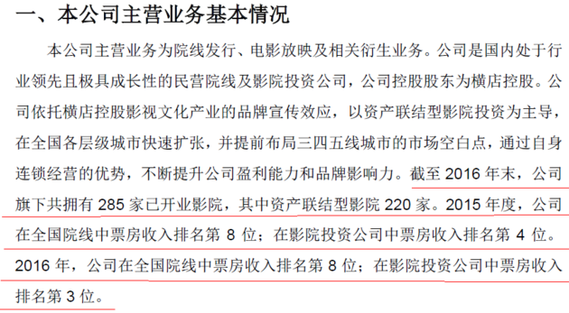 据最新披露的招股书(申报稿),横店影视2016年总营收为22.80亿元,净利润3.56亿元,其中电影放映业务营收为17.86亿元,卖品业务营收2.38亿元。截至2016年底,横店影视拥有资产联结型影城220家,2016年在全国院线中票房收入位列第8位,在影院投资公司票房收入中位列第3名,共有全资影院42家和参股影院2家。