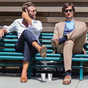 锃亮的皮鞋虽然优雅,但是容易闷脚、刮脚。不妨换成乐福鞋、布洛克、豆豆鞋或者纯色的帆布鞋。