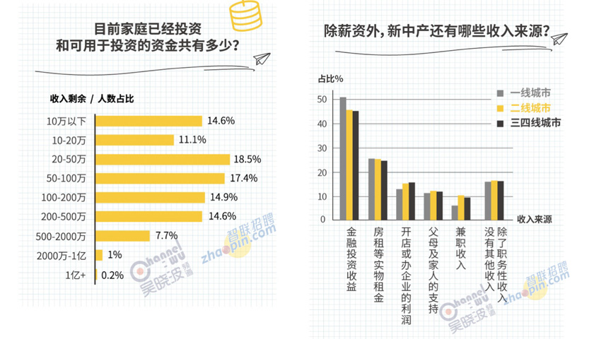 新中产群体不再单纯依赖本职工作谋生,拥有工资、奖金等职务性收入的受访者只占86%。82.5%的新中产除了职务性收入,还有其他多元化的经济来源。调查发现一线城市人群多由金融资产投资上获益,拥有金融投资收益的一线城市新中产占51.5%。二线年轻人在保证本职工作以外更喜欢兼职创业。16.2%的二线城市新中产通过开店或办企业来增加收入,而这个比例在一线城市为12.8%。