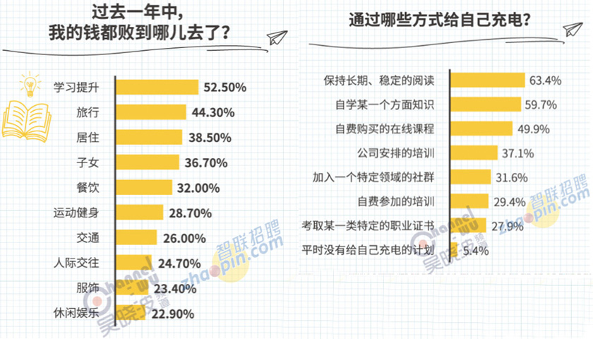 新中产阶级最大的特点是价值观,这个群体拥有强大的自我提升意识。个人充电方面自发行为明显高于公司安排的比例,50%受访者选择“自费购买在线课程”。《“多重职业”成为全球新趋势》的作者Susan Kuang作为斜杠青年拥有多项事业,为方便健身自己考取了CrossFit一级教练资格证,把需求转换成对自己的技能投资。