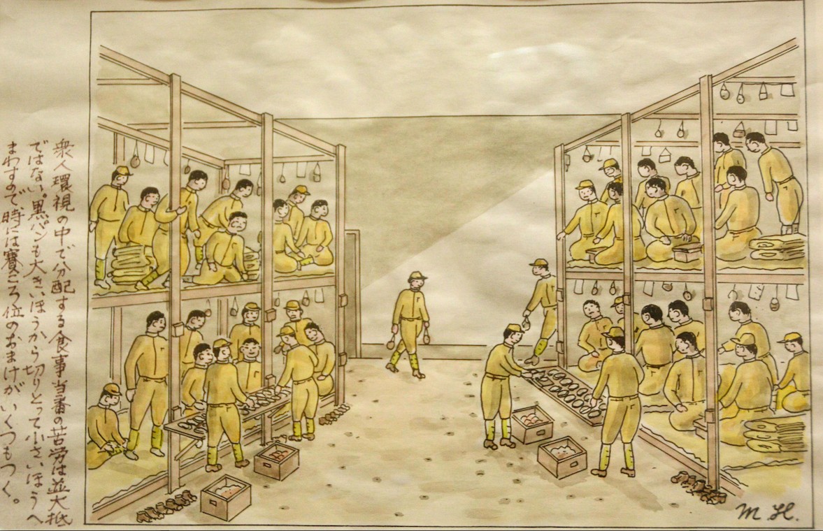 抵达战俘营时,谦二还穿着日本军服,身上带着的物品只有饭盒、水壶、军用毛毯以及几件日用品,连杯子、牙刷和换洗的内衣都没有。此外,他还有一面日本国旗,是入伍时特别配给的物品,在去西伯利亚的途中,谦二一直把这面国旗当浴巾用。到达战俘营的十天后,这面国旗就被苏联人没收了,在谦二看来,没收国旗也不是处于什么意识形态上的考虑,大概是拿去当围巾了。