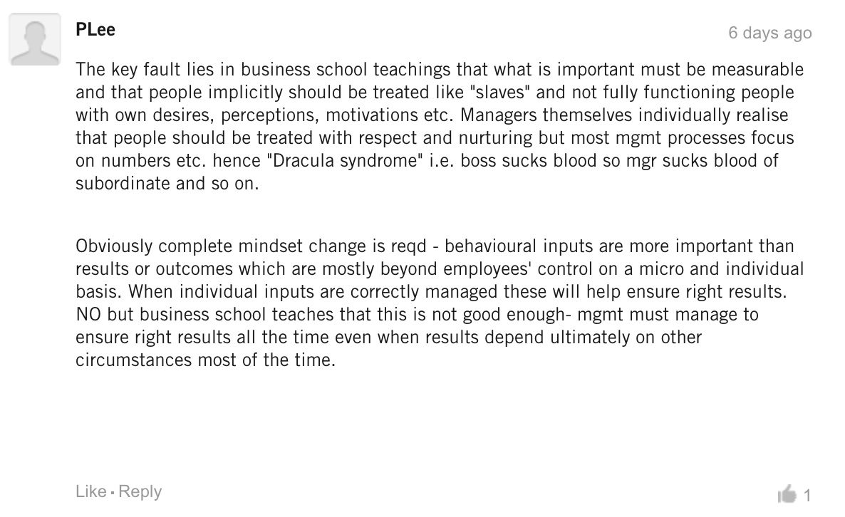 “这主要要怪商学院,商学院一直告诉我们真正重要的东西是可以量化分析的东西,员工应该暗中被当做‘奴隶’对待,忽略他们自己的欲望、认知和动机。经理们在个人层面上意识到应该尊重员工、培育员工,但多数管理流程关注数字,所以造成了这种‘吸血现象’——老板压榨经理,经理压榨下属,以此类推。