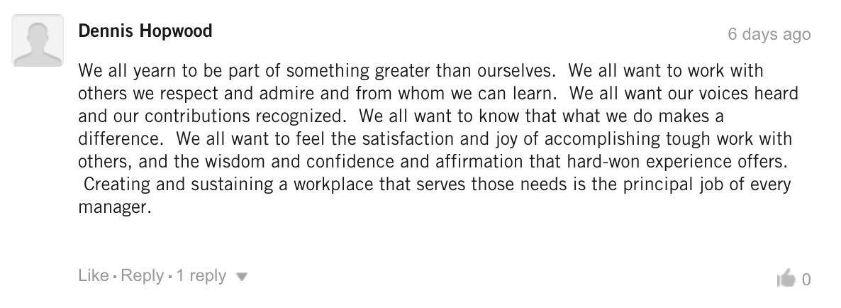 “我们都希望成为一个大团体的一部分。我们都希望能和我们尊敬、喜爱的人共事并从他们身上学到东西。我们都希望自己的意见能被倾听、我们的贡献能被认可。我们都希望知道自己能够带来改变。我们都希望感受到与其他人一起完成困难工作后的那种满足感和喜悦感,从那段艰难的经历中收获智慧、信心和肯定。创造能够满足这些需求的职场是每一个经理的主要任务。”