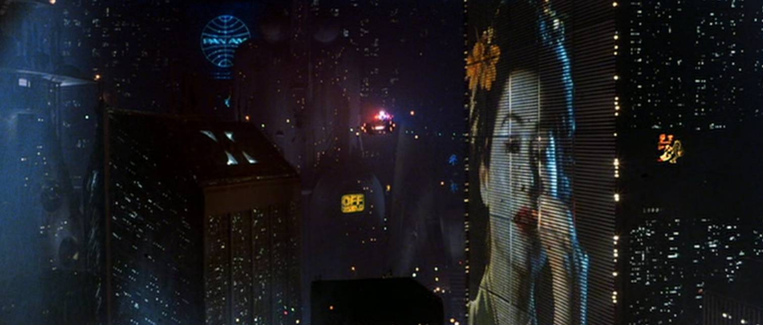 ▲[银翼杀手]中那些令人印象深刻的商业广告,日本艺妓的容貌出现在高耸入云的广告牌上