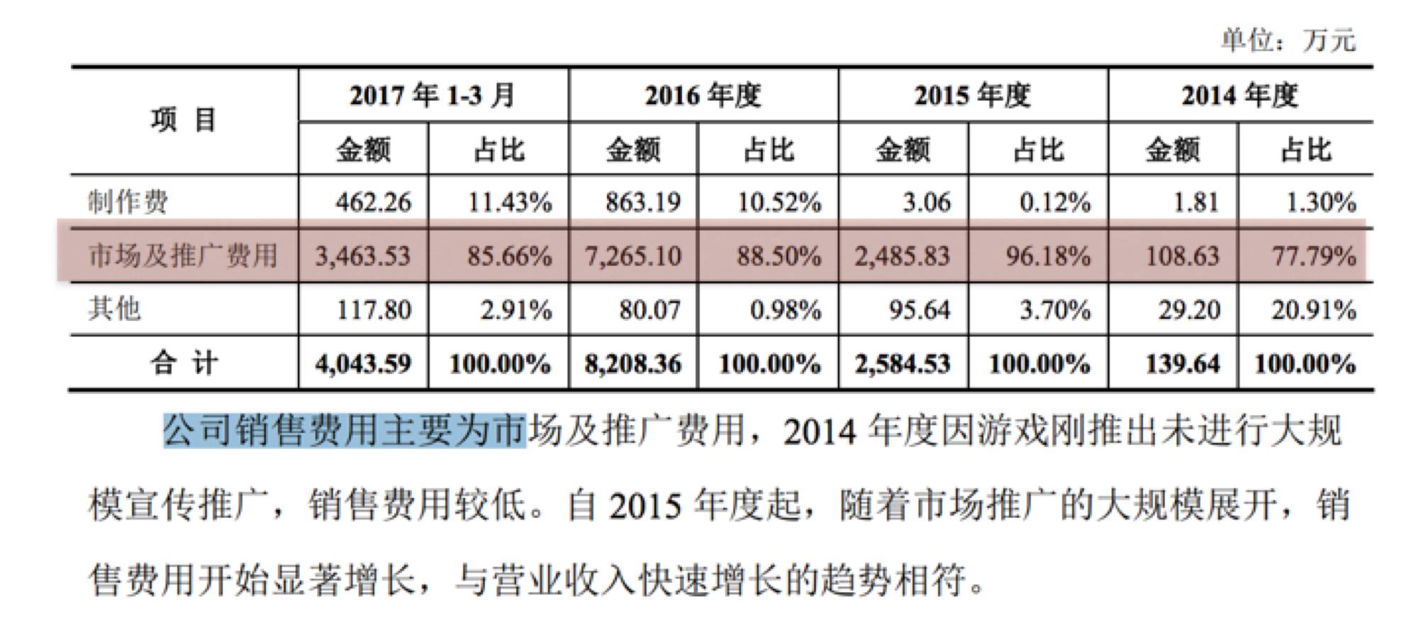 值得注意的是,为了持续保持热度,在市场上已经大力推广运作2年的《宾果消消消》,2017年一季度销售费用继续攀升,高达4044万元,这几乎相当于2016年一整个年度营销费用的一半,占比同期营业收入的45%,是同期净利润的3倍。